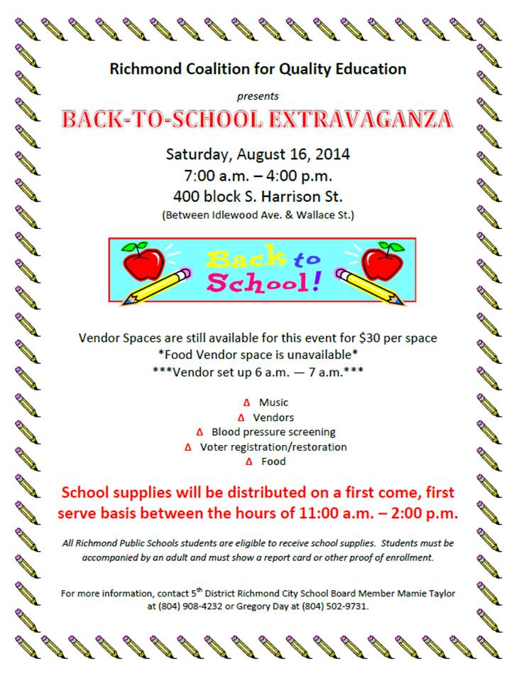 For more information, contact 5th District Richmond City School Board Member Mamie Taylor at (804) 908-4232 or Gregory Day at (804) 502-9731.